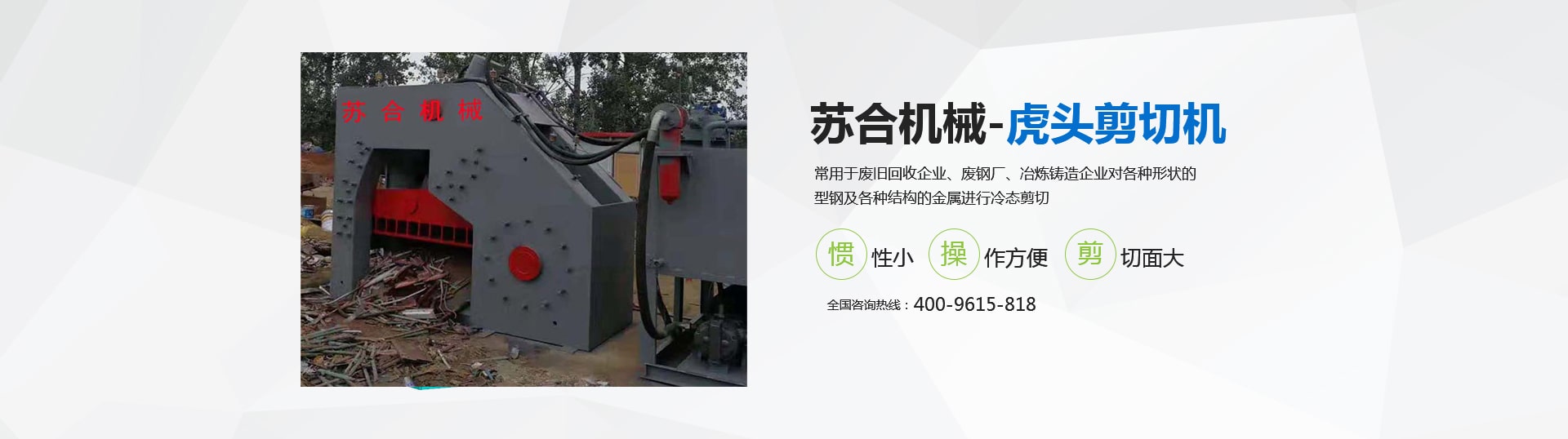 虎頭剪具有體積小、重量輕、慣性小、噪音低、動作平穩、操作方便、靈活、剪切斷面大、剪刀口調整方便等優點,操作使用安全。常用于廢舊回收企業、廢鋼廠、冶煉鑄造企業對各種形狀的型鋼及各種結構的金屬進行冷態剪切。剪切機的用途就是用來剪切定尺、切頭、切尾、切邊、切試樣及切除軋件的局部缺陷等。 滑縣蘇合機械制造有限公司性能穩定,操作簡單。歡迎來電咨詢 <了解更多>